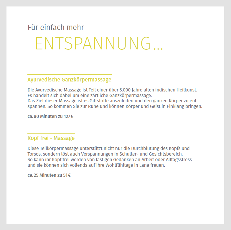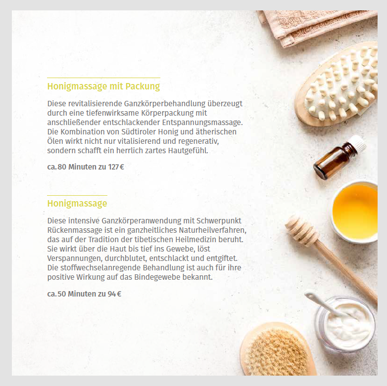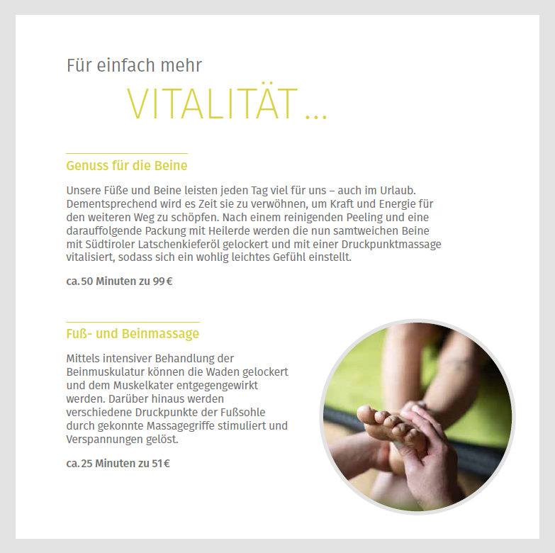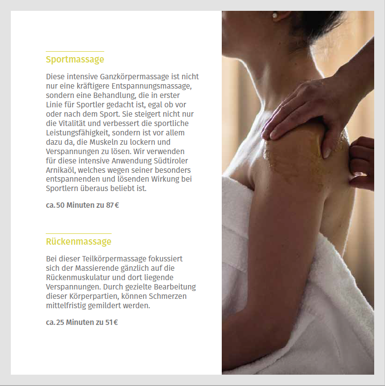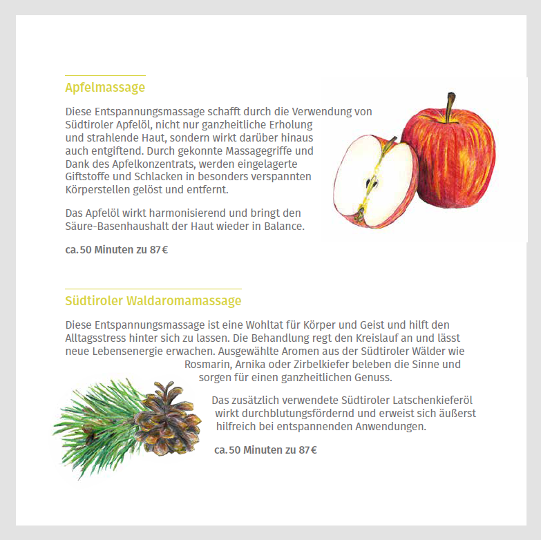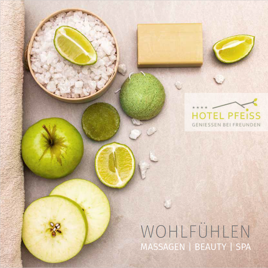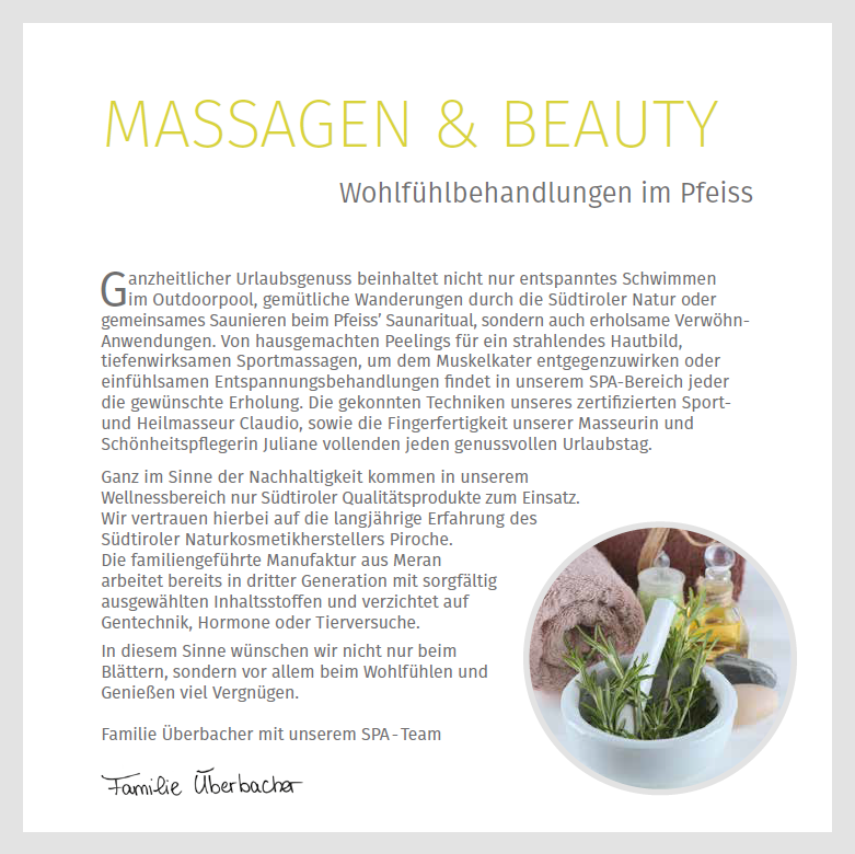 Ganzheitlicher Urlaubsgenuss beinhaltet nicht nur entspanntes Schwimmen im Outdoorpool, gemütliche Wanderungen durch die Südtiroler Natur oder gemeinsames Saunieren beim Pfeiss‘ Saunaritual, sondern auch erholsame Verwöhn-Anwendungen. Von hausgemachten Peelings für ein strahlendes Hautbild, tiefenwirksamen Sportmassagen, um dem Muskelkater entgegenzuwirken oder einfühlsamen Entspannungsbehandlungen findet in unserem SPA-Bereich jeder die gewünschte Erholung. Die gekonnten Techniken unseres zertifizierten Sport- und Heilmasseur Claudio, sowie die Fingerfertigkeit unserer Masseurin und Schönheitspflegerin Juliane vollenden jeden genussvollen Urlaubstag.