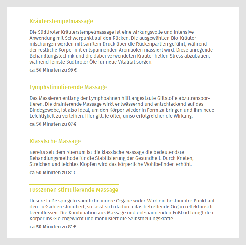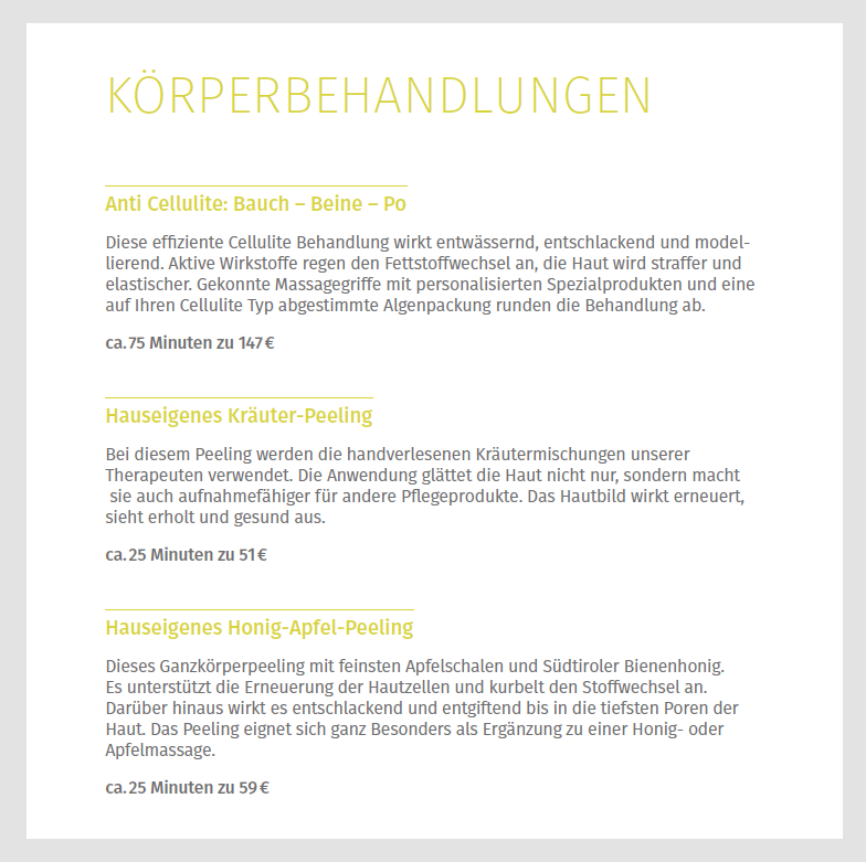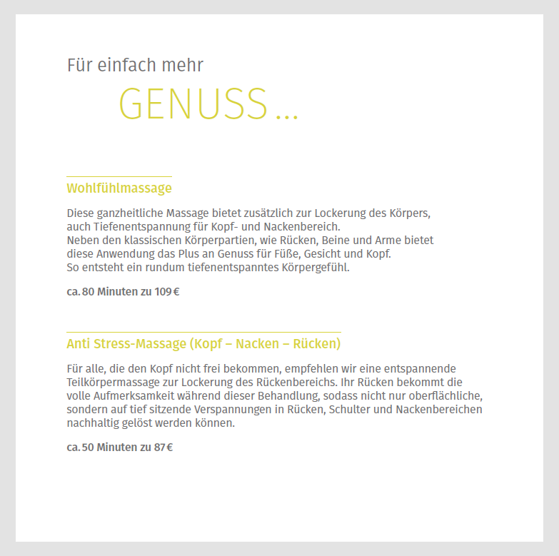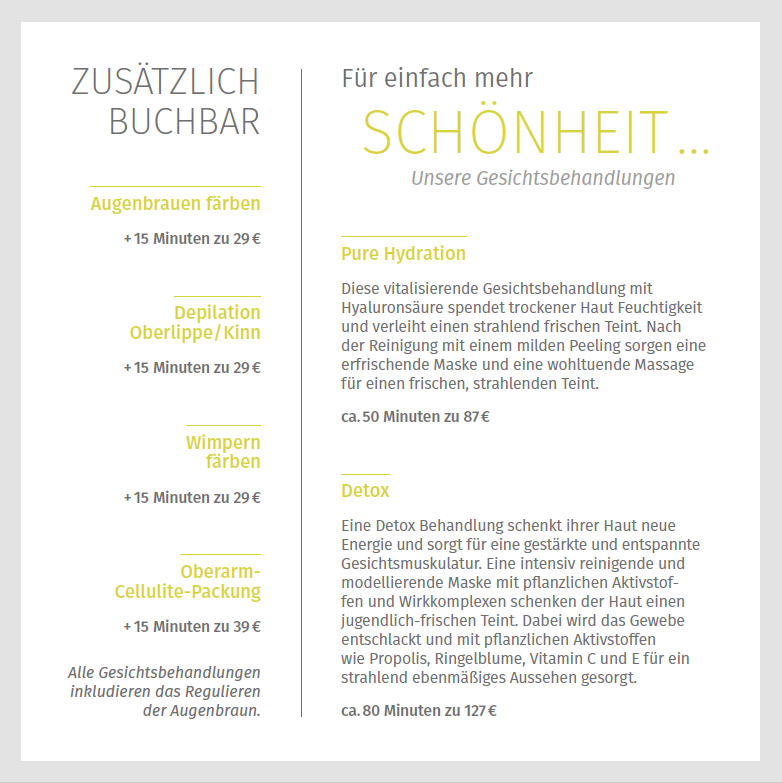 Grundsätzlich bieten wir unsere Behandlungen ausschließlich für Erwachsene (ab 18 Jahren) an. Sollten junge Erwachsene (ab 16 Jahren) nichtsdestotrotz Interesse an unseren Anwendungen zeigen ist es möglich folgende Behandlungen anzubieten: Gesichtsbehandlung (ca. 50 Min. zu € 85) oder Rücken- und Beinmassage (ca. 25 Min. zu € 49). Natürlich können auch kosmetische Anwendungen, wie Maniküre, Pediküre, ect. gebucht werden.
