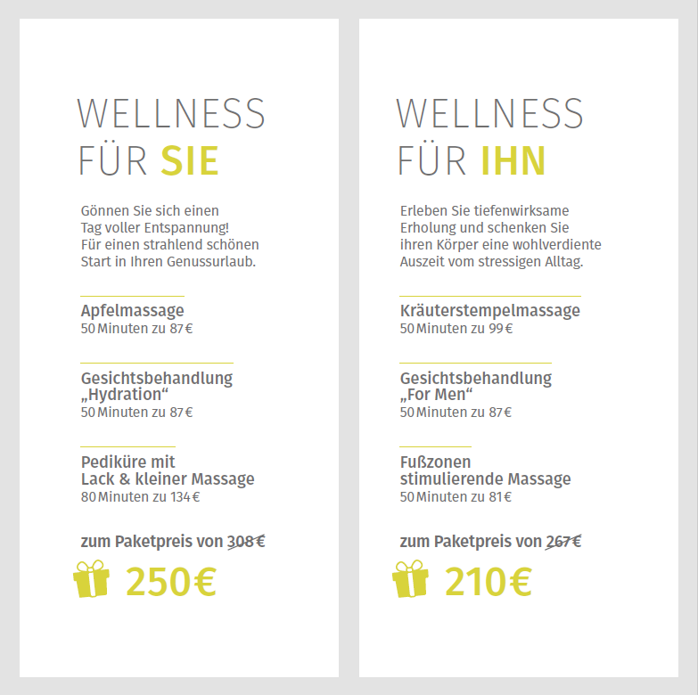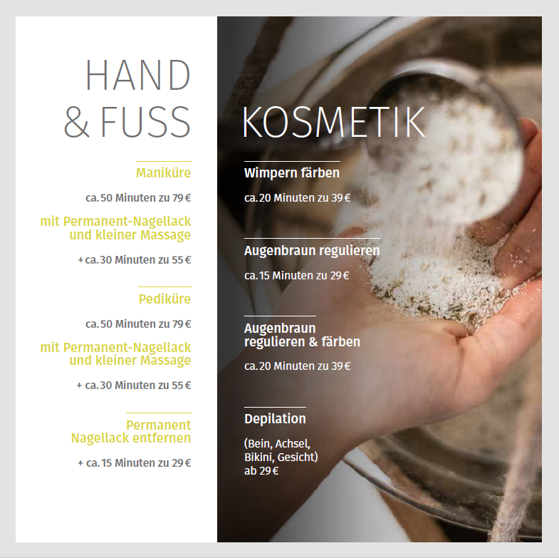 Wir empfehlen alle gewünschten Massagen, Beautyanwendungen oder Pakete bereits vor Anreise zu buchen, um individueller auf Wunschtermine eingehen zu können. Für Terminbuchungen vor Ort, wird empfohlen sich direkt an die Rezeption zu wenden. Diese ist täglich von 8 bis 22 Uhr geöffnet und unter der Nummer 900 mit dem Zimmertelefon erreichbar.